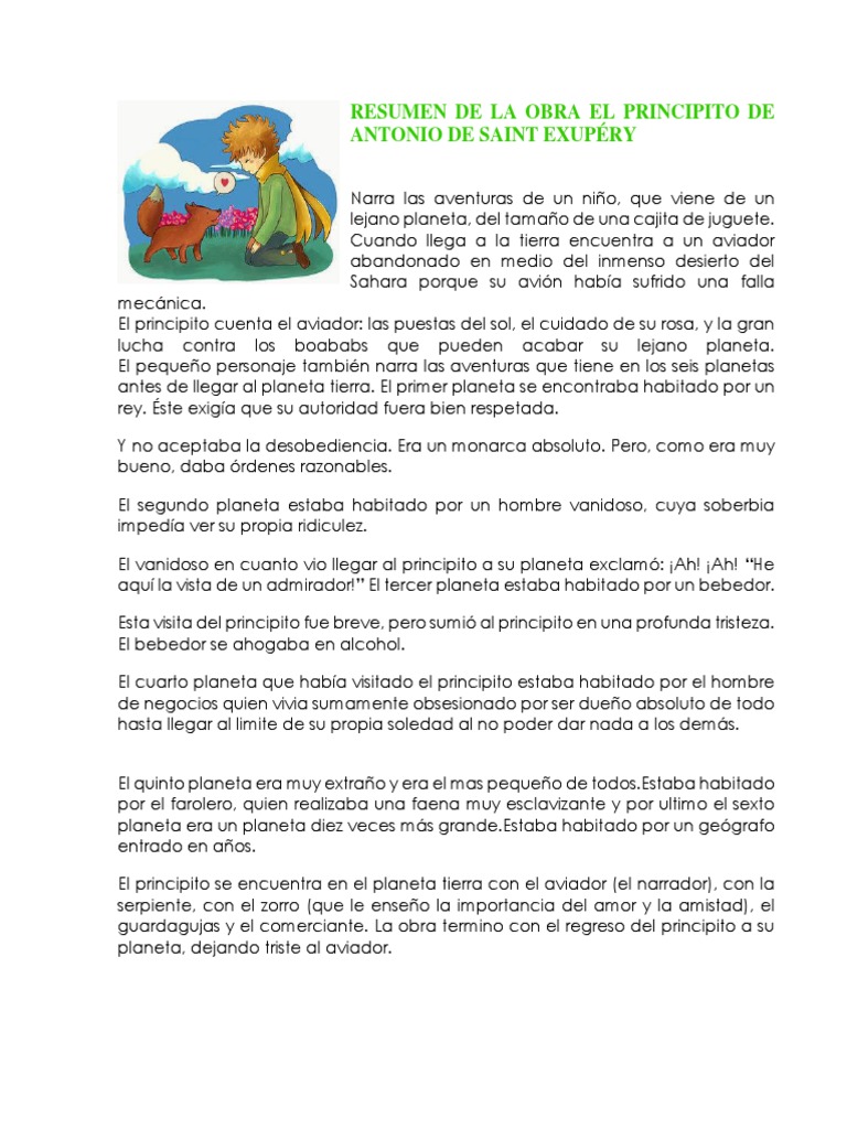 1 de abril de 2014. Resumen del libro el principito. Lunes, 30 de enero de 2017. Resumen de la obra el principito de antonio de saint exupéry. Un día en el suelo del asteroide del principito nace una flor.